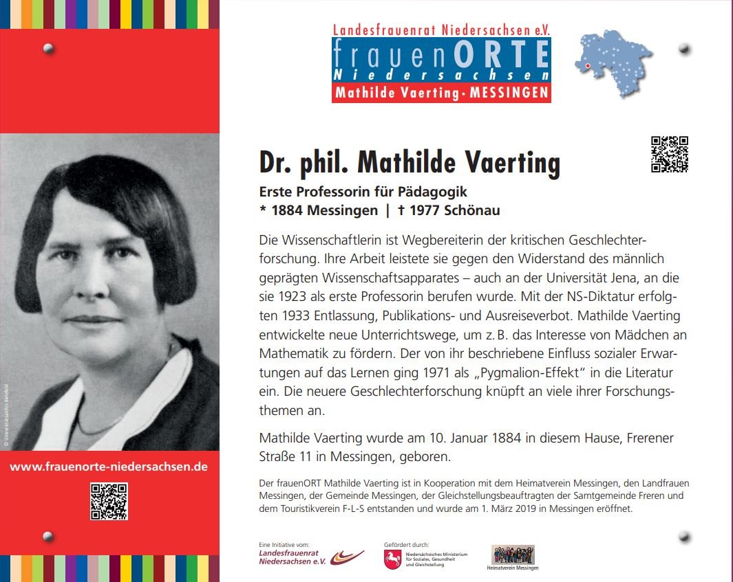 Der frauenORT Mathilde Vaerting ist in Kooperation mit dem Heimatverein Messingen, den Landfrauen Messingen, der Gemeinde Messingen, der Gleichstellungsbeauftragten der Samtgemeinde Freren und dem Touristikverein F-L-S entstanden und wurde im März 2019 eröffnet.